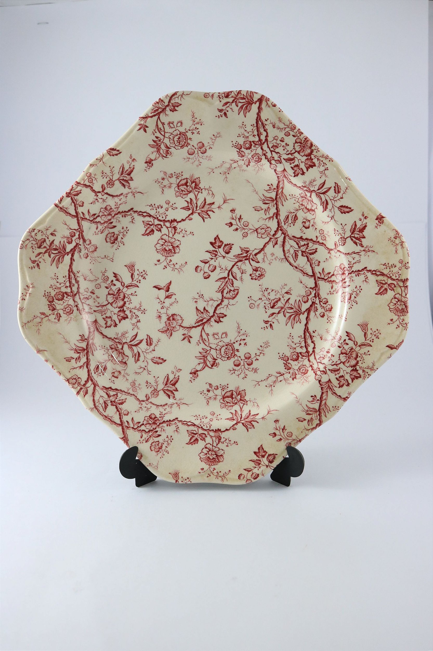 Belo prato oitavado em faiança inglesa rico em pintura de flores na cor rouge de fer, fazendo um belo desenho em decoração na parede ou sobre um móvel.