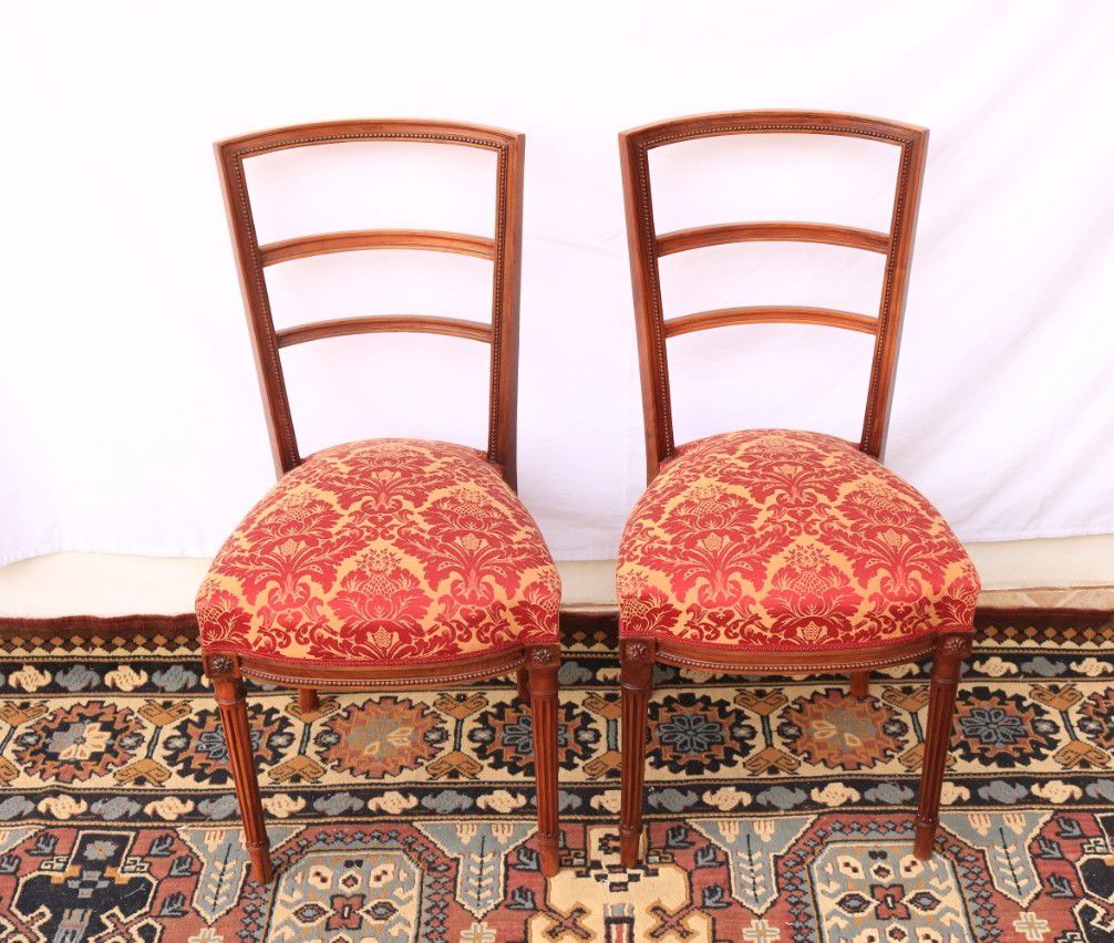 Raro par de Cadeiras Francesas cerca de 1900, perfeito estado, restaurada, madeira nobre, belíssimo e delicado entalhe. Estofamento conservado com molas originais, tecido de qualidade. Compõe bem qualquer ambiente, quarto, sala, ao lado de um aparador, de mesas, na sala de visitas, muito versátil.