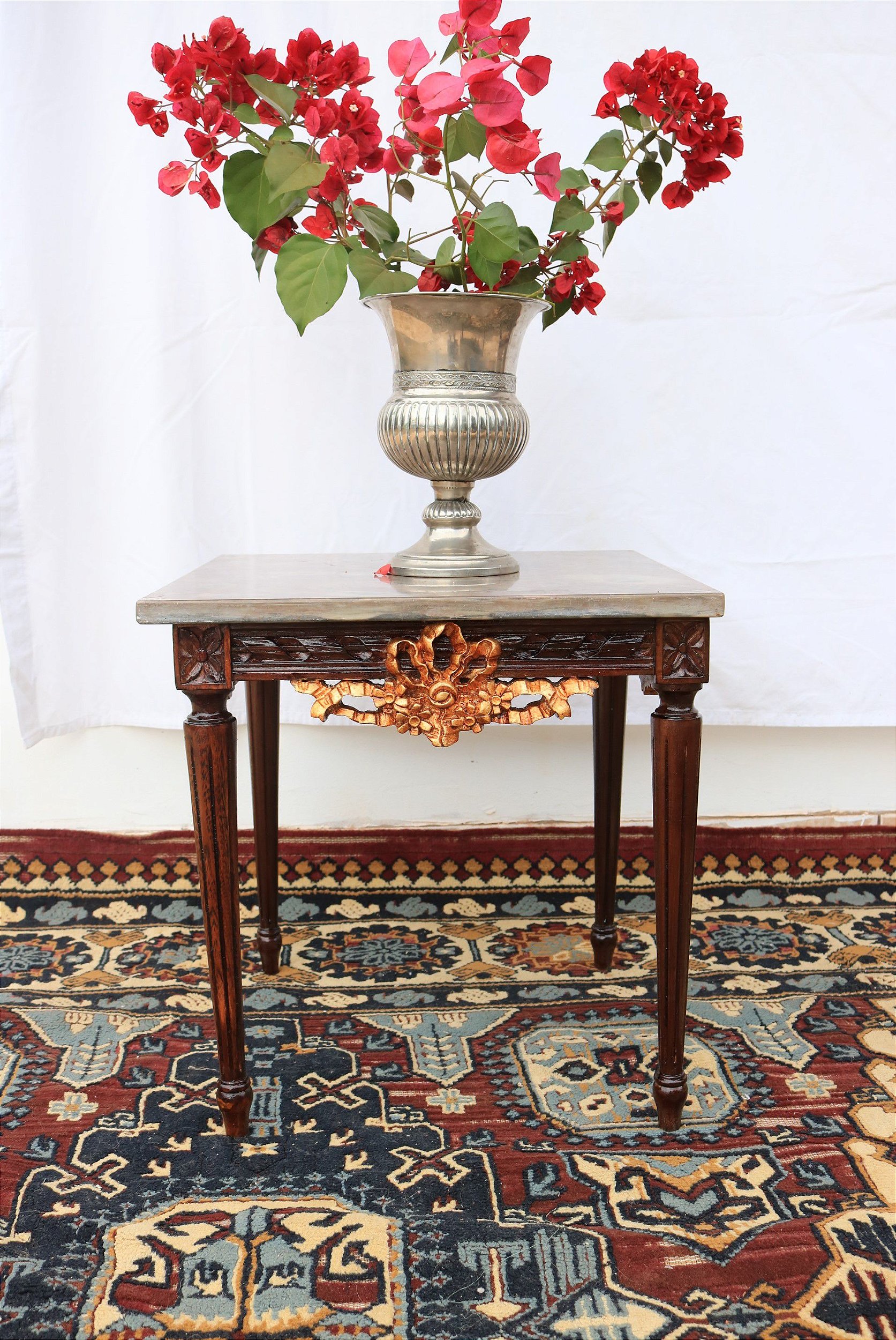 Conjunto de mesas estilo Luís XVI anos 60 com pedra de mármore português, frisos e entalhes manuais, todas com 4 acabamentos de flores e laços entalhados à mão e folheados a ouro. Medidas: centro 1.00 x 0.50 cm, laterais: 0.50 x 0,50m.