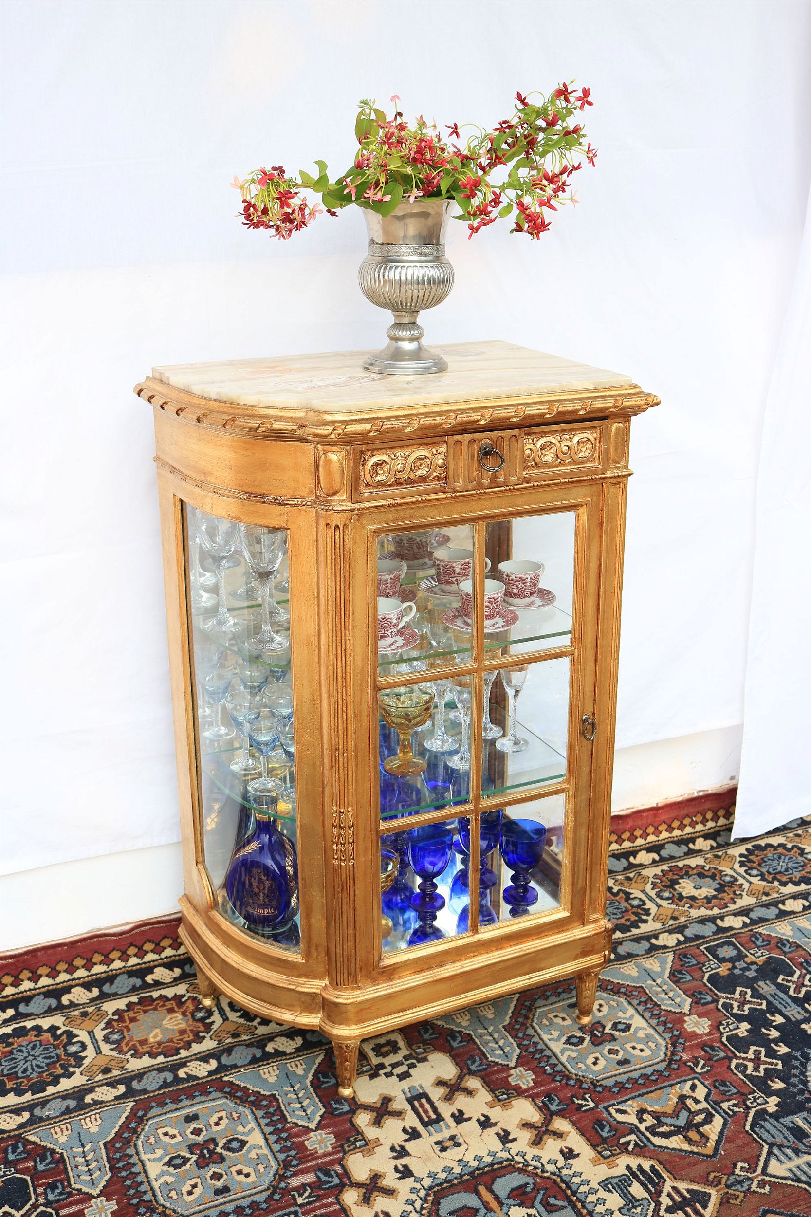 Delicada VITRINE BOMBÊ, Louis XVI, datada de 1.919, que fez parte de uma cristaleira com duas vitrines laterais. Peça histórica, que por sua riqueza de detalhes e entalhes foi restaurada, folheada a ouro e adaptada para continuar enriquecendo ambientes. Pedra ônix original, restaurada e polida. Medidas: 60 x 40 x 1.30
